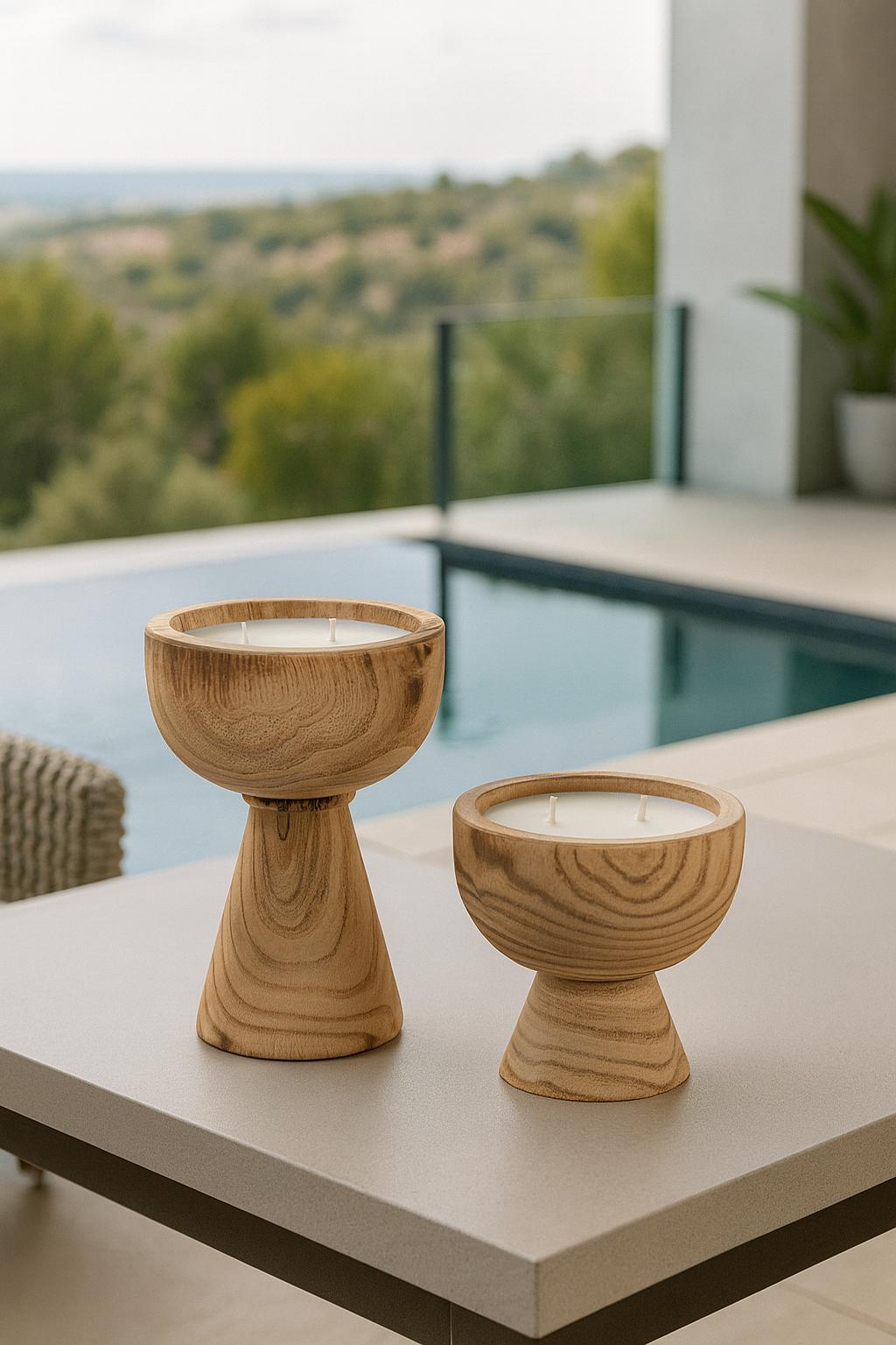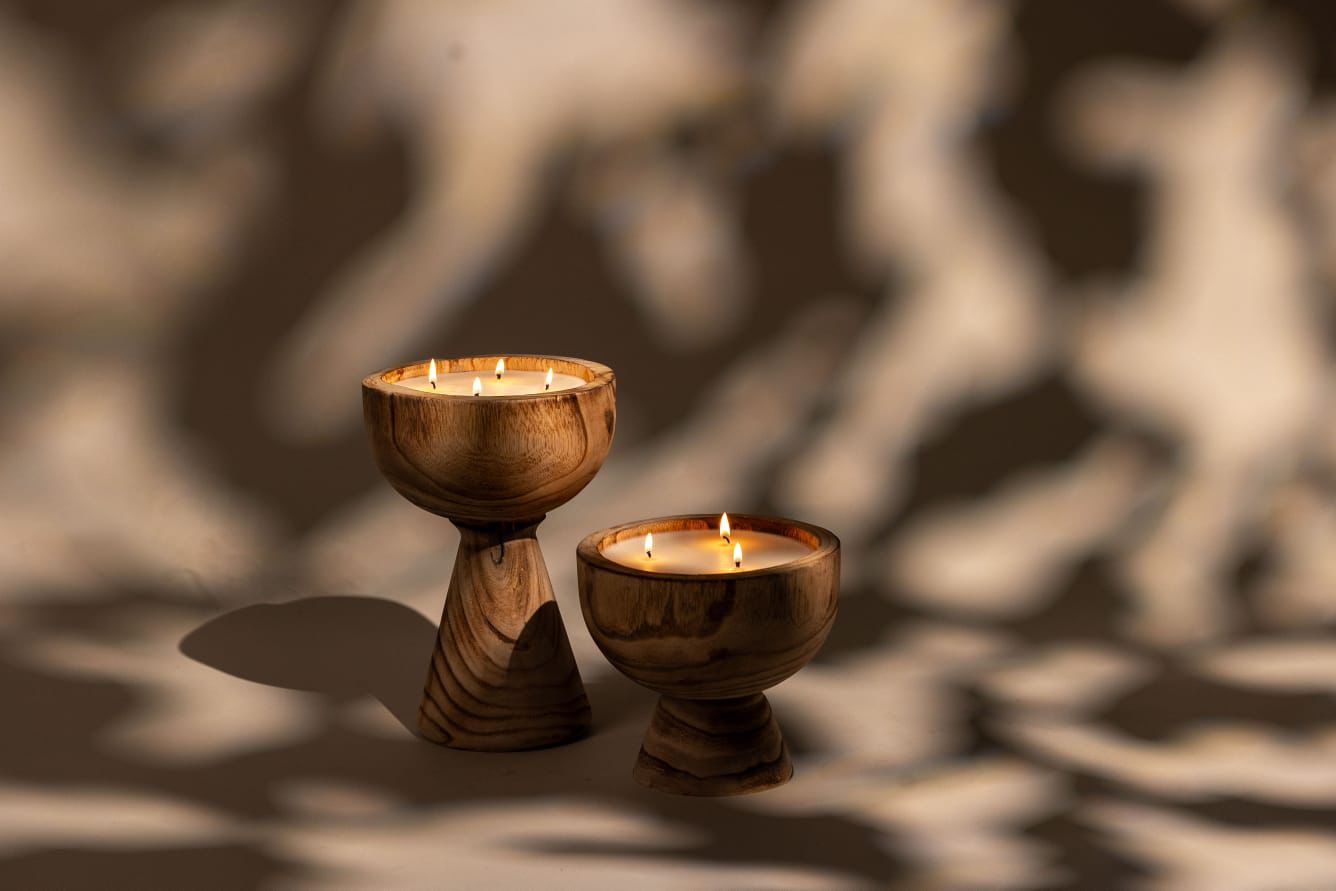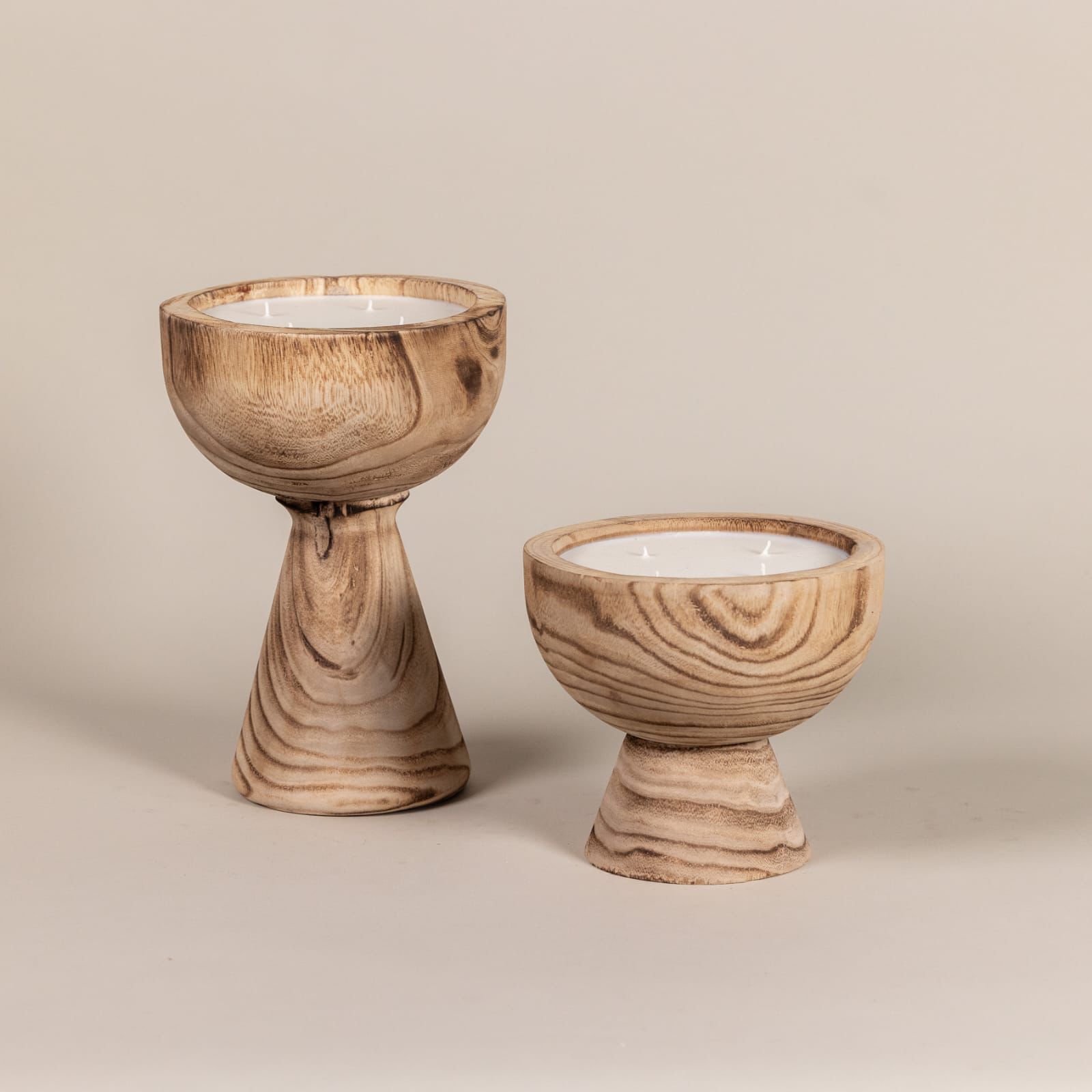 נר ריחני בכלי עץ בצורת גביע, במראה טבעי ומרשים.